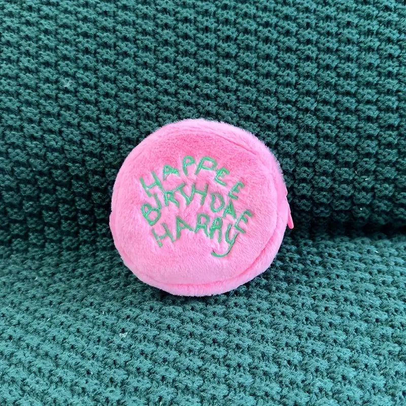 Deze unieke portemonnee is vormgegeven als een roze slagroomtaart met groene, met de hand geschreven letters: "Happee Birthdae Harry". Het zachte materiaal en de zorgvuldige afwerking zorgen voor een hoogwaardige look & feel, terwijl het compacte formaat hem perfect maakt voor dagelijks gebruik.